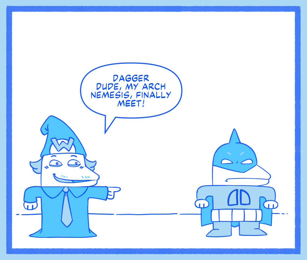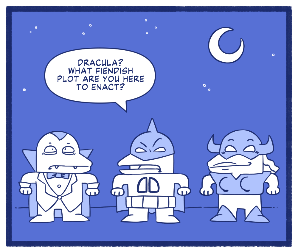 Superhero parody comics featuring dubious characters such as Great Guy, Demon Dame, and Dagger Dude. Questionable morals and deeds abound.